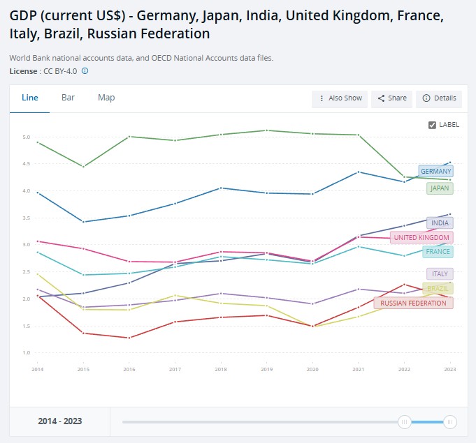 以PPP購買力平價計的2024年GDP,印度16萬億美元排全球第三,領先俄羅斯的6.9萬億美元還要多出很多。中美印三國人口就是前三,不少產業的硬數據基本是全球前三。三四年後,印度匯率GDP正式超過日本與德國來到第三位,完全可以預料。
