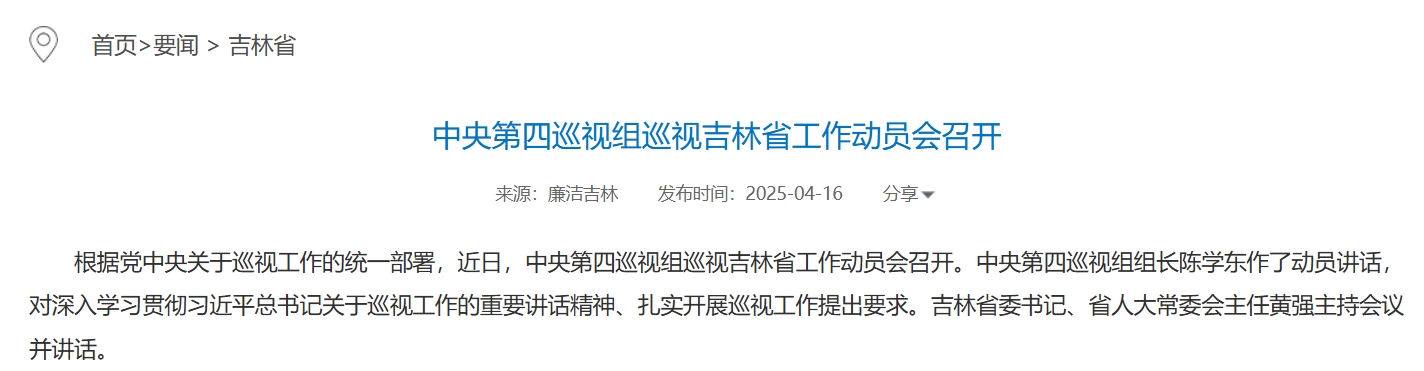 根據黨中央部署,本輪巡視期間,中央第四巡視組還將會同吉林省委第十二巡視組對長春市開展聯動巡視。