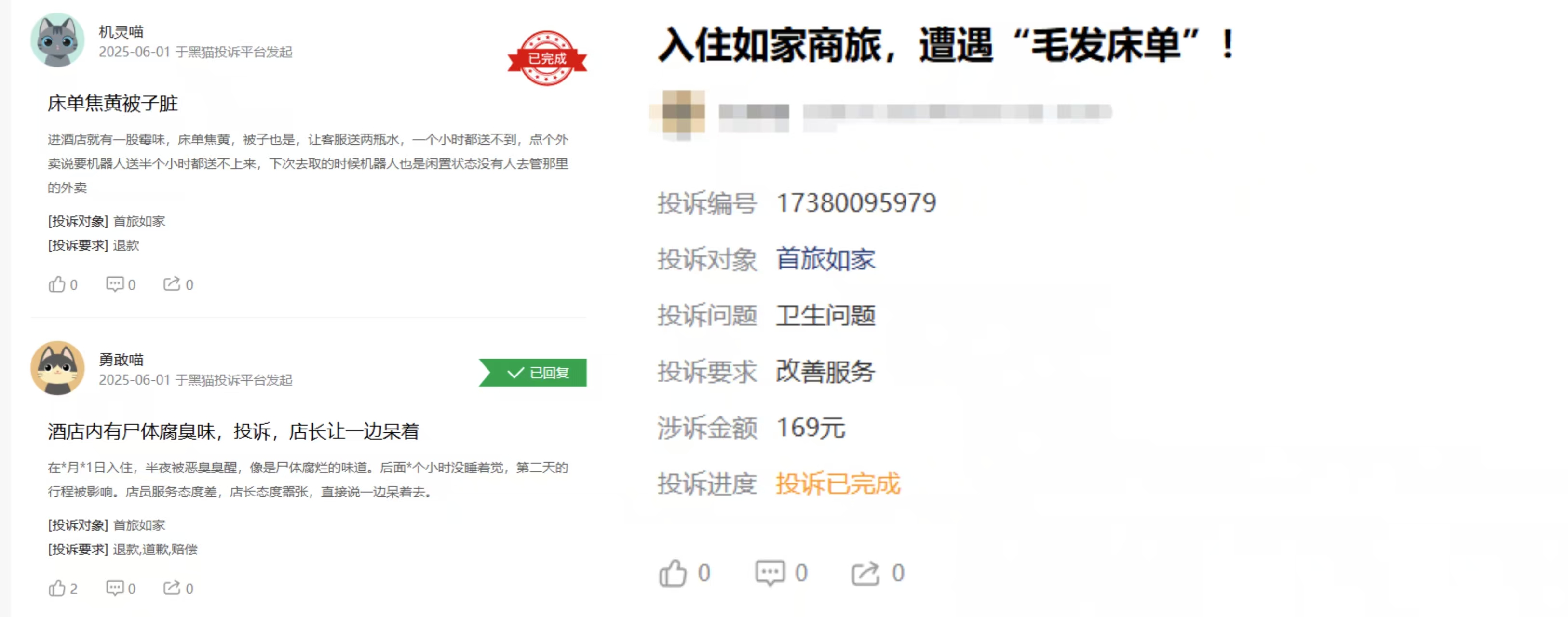而現在,酒店布草衞生問題已成為消費者投訴的 “重災區”,眾多連鎖品牌和高端酒店都未能倖免。在黑貓投訴平台上進行搜索,亞朵、如家等連鎖品牌都身陷布草相關衞生問題的投訴漩渦,大量消費者的不滿聲撲面而來。