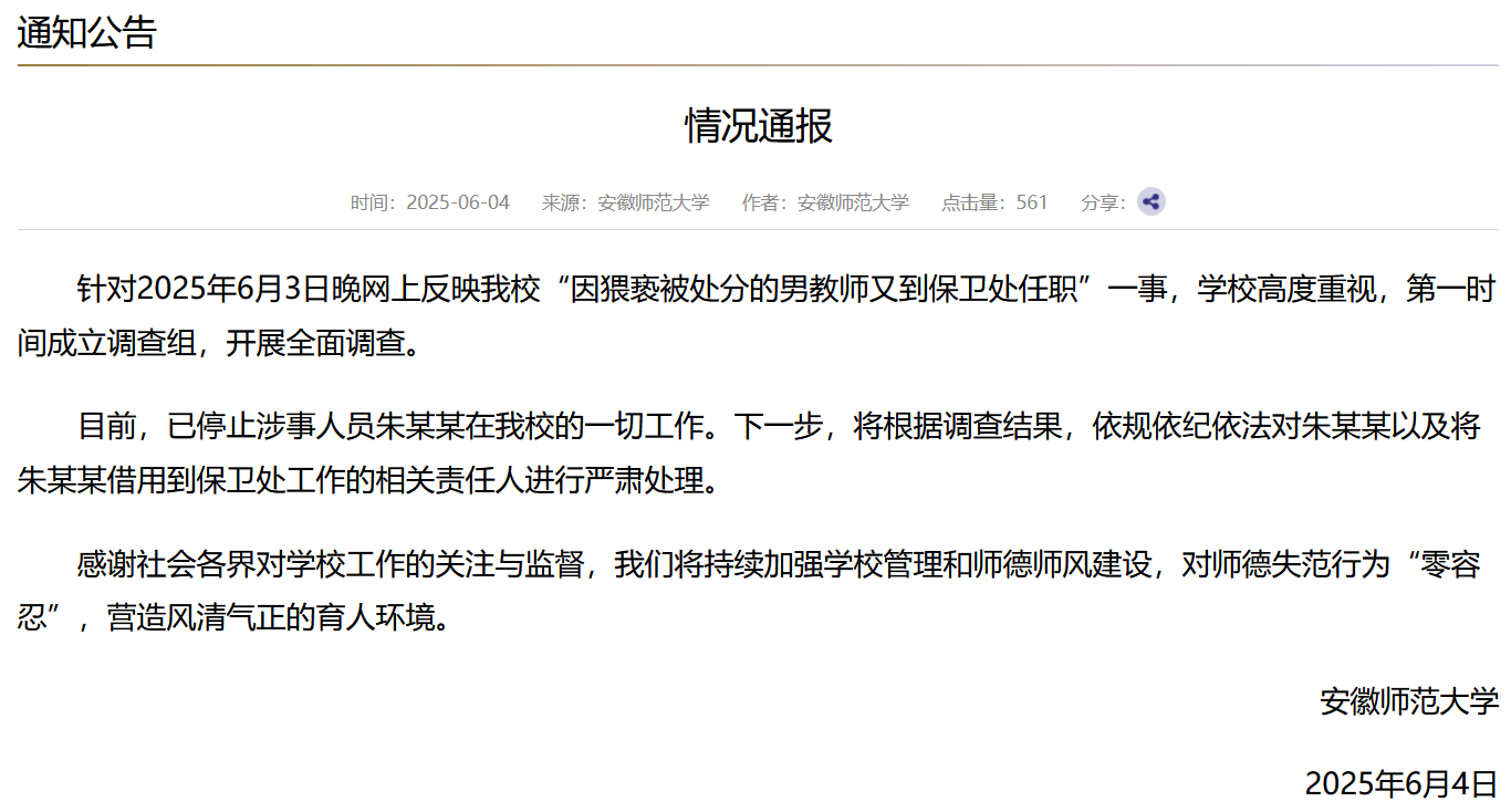 安徽師範大學通報“因猥褻被處分的男教師又到保衞處任職”:停止朱某某一切工作