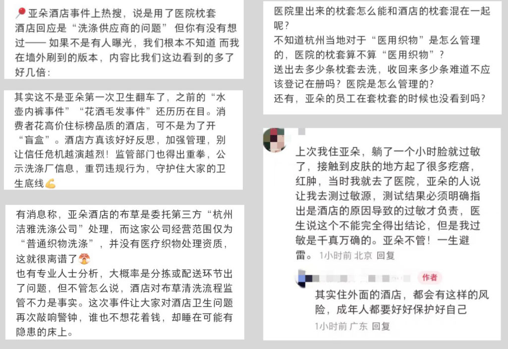 6月3日,有網友發帖稱入住杭州西溪紫金港亞朵酒店時,發現枕套印有杭州某醫院“標籤”。此消息引發廣泛關注和熱議,有網友表示“醫院布草流入酒店客房,是否代表酒店在布草清洗、更換等環節可能存在漏洞?”也有網友擔心 “兩者混用會引發病菌傳播”。