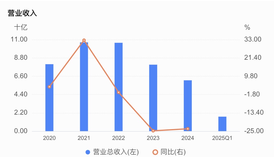 財報顯示,2025年一季度公司營收同比下降9.67%至17.36億元,淨利潤下滑21.44%至3.79億元。這一頹勢已延續數年——2024年公司營收僅61億元,淨利潤2億元。