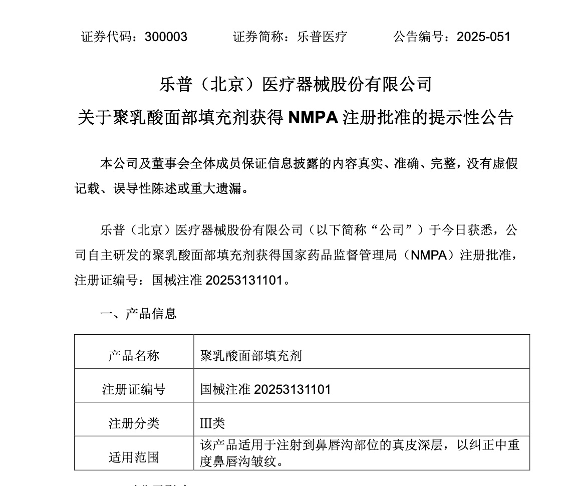 6月3日晚間,樂普醫療公告表示公司自主研發的聚乳酸面部填充劑獲得國家藥品監督管理局(NMPA)註冊批准,註冊證編號:國械注準 20253131101。