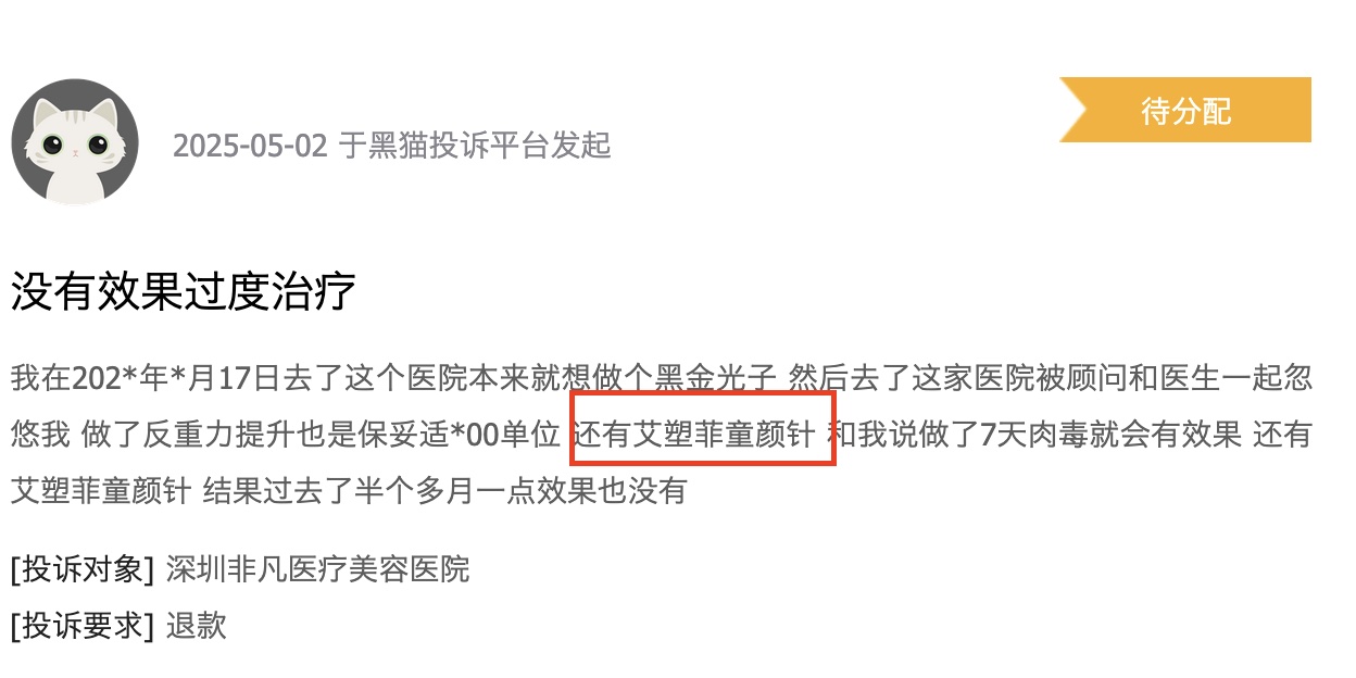 今年有消費者投訴稱,在北京某機構注射艾塑菲童顏針後,未能實現宣傳的輪廓固定、全面部提升效果。黑貓投訴平台上也存在多起 “毫無效果” 的指控。