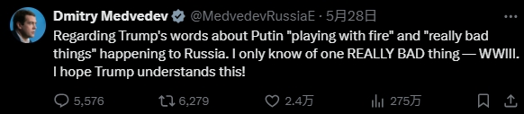 俄羅斯聯邦安全會議副主席梅德韋傑夫28日曾在X平台上作出回應。他警告説:“至於特朗普有關普京‘在玩火’以及俄羅斯‘發生很多非常糟糕的事情’的言論,我只知道一件真正糟糕的事情——第三次世界大戰。我希望特朗普能夠明白這一點。”