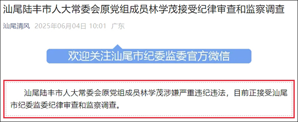 據廣東汕尾市紀委監委微信公眾號“汕尾清風”6月4日消息,汕尾陸豐市人大常委會原黨組成員林學茂涉嫌嚴重違紀違法,目前正接受汕尾市紀委監委紀律審查和監察調查。