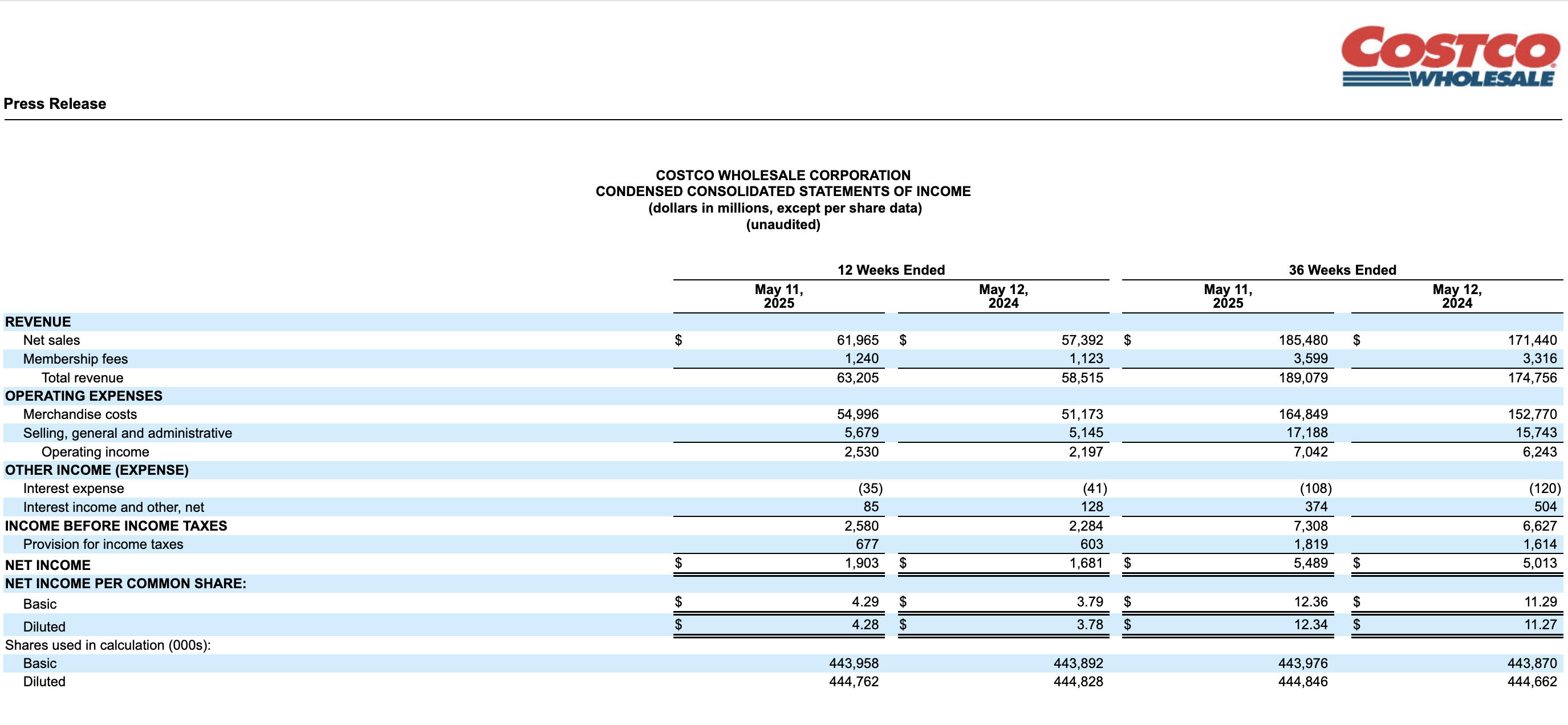 5月30日,國際零售巨頭開市客Costco(股票代碼:COST.US)正式披露了2025財年第三季度財務報告。數據顯示,其於本財季(截至2025年5月11日的前三個月)共實現總營收632億美元(約合人民幣4547億元),同比增長8.0%;淨利潤19億美元(約合136.6億元),同比增長13%。攤薄後每股收益4.28美元,較預期高出0.04美元。