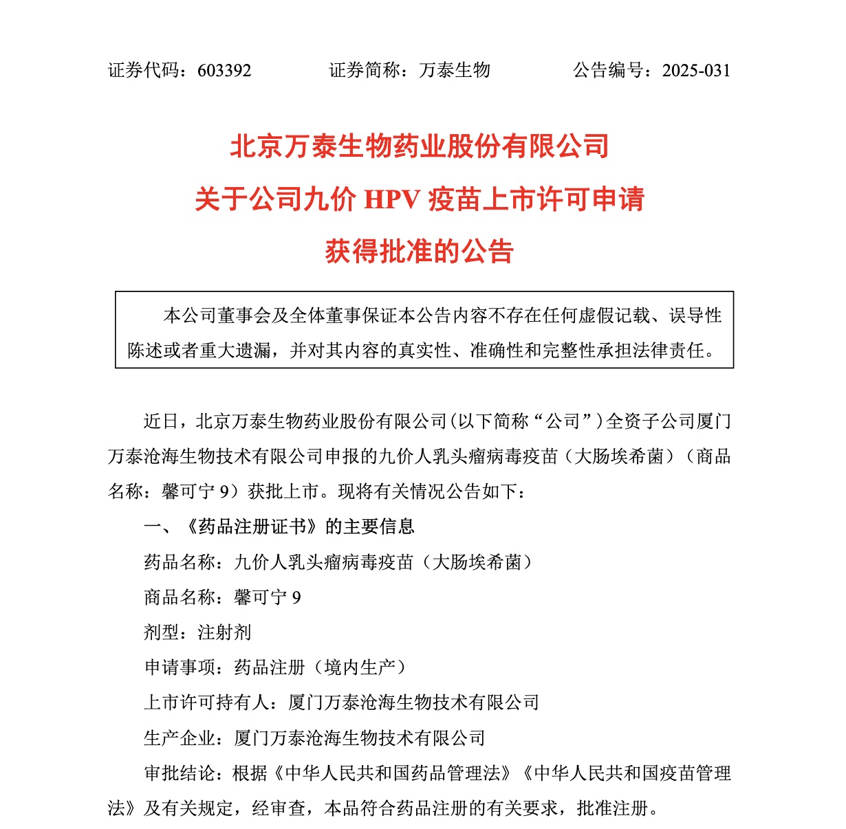 6月4日晚,萬泰生物(603392.SH)一則公告攪動國內疫苗市場:全資子公司廈門萬泰滄海生物技術有限公司申報的九價人乳頭瘤病毒疫苗(商品名:馨可寧9)正式獲得國家藥品監督管理局批准上市。