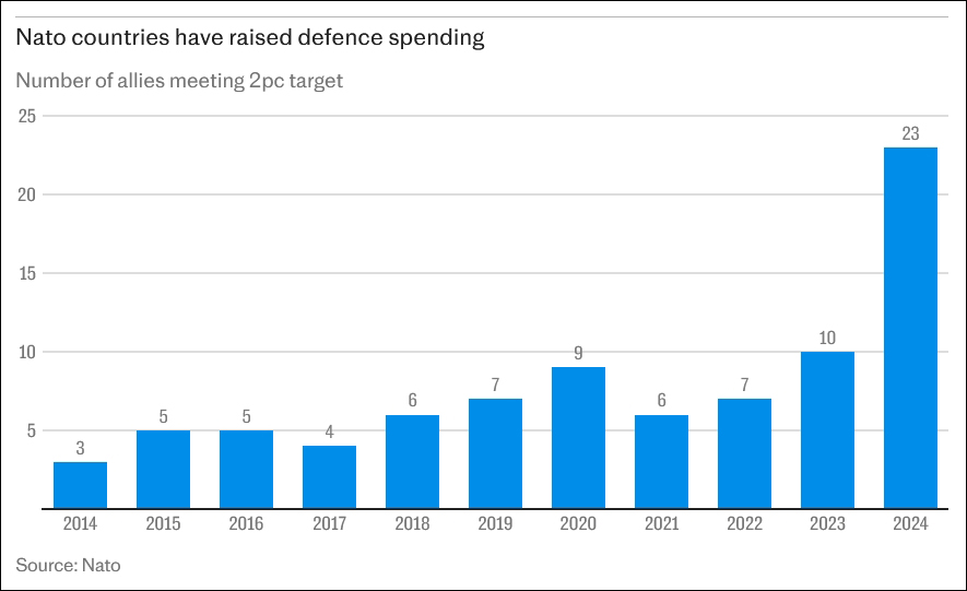 2014年至2024年,軍費開支達到佔GDP 2%的北約成員國數量 《電訊報》製圖
