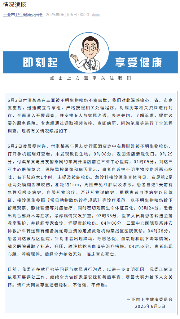 6月2日付淇某某在三亞被不明生物咬傷不幸離世,我們對此深感痛心。省、市高度重視,迅速成立專家組,嚴格按照相關處理程序,對病歷等相關資料進行封存,全面深入開展調查,並安排專人與家屬溝通,表達關切、瞭解訴求,提供必要的服務保障。專家組通過調取視頻監控、查閲病歷、問詢筆錄等進行了全流程調查。現將有關情況續報如下: