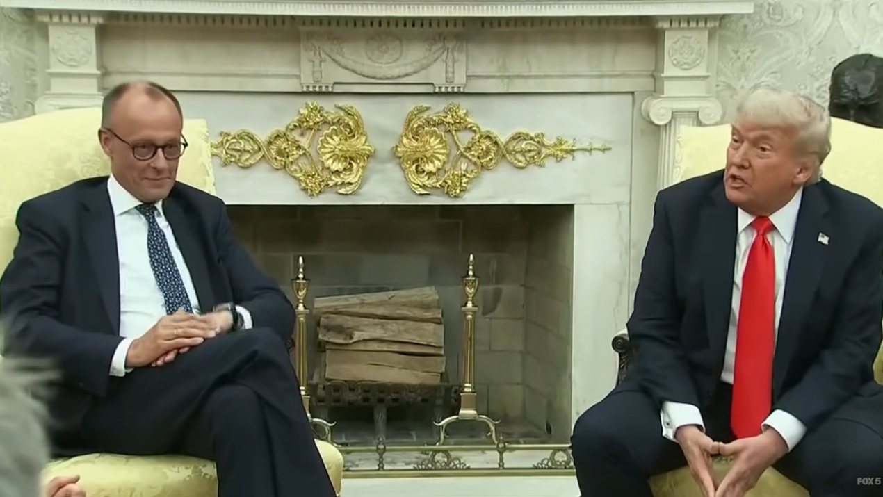 當地時間6月5日,特朗普在白宮與德國總理默茨會面。美媒視頻截圖