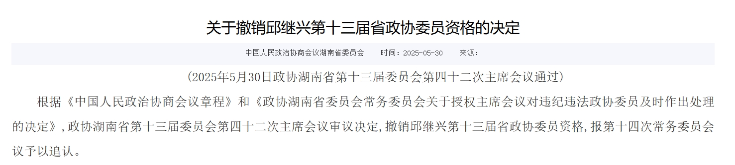 據湖南省政協網站5月30日的一則公告信息,根據《中國人民政治協商會議章程》和《政協湖南省委員會常務委員會關於授權主席會議對違紀違法政協委員及時作出處理的決定》,政協湖南省第十三屆委員會第四十二次主席會議審議決定,撤銷邱繼興第十三屆省政協委員資格,報第十四次常務委員會議予以追認。