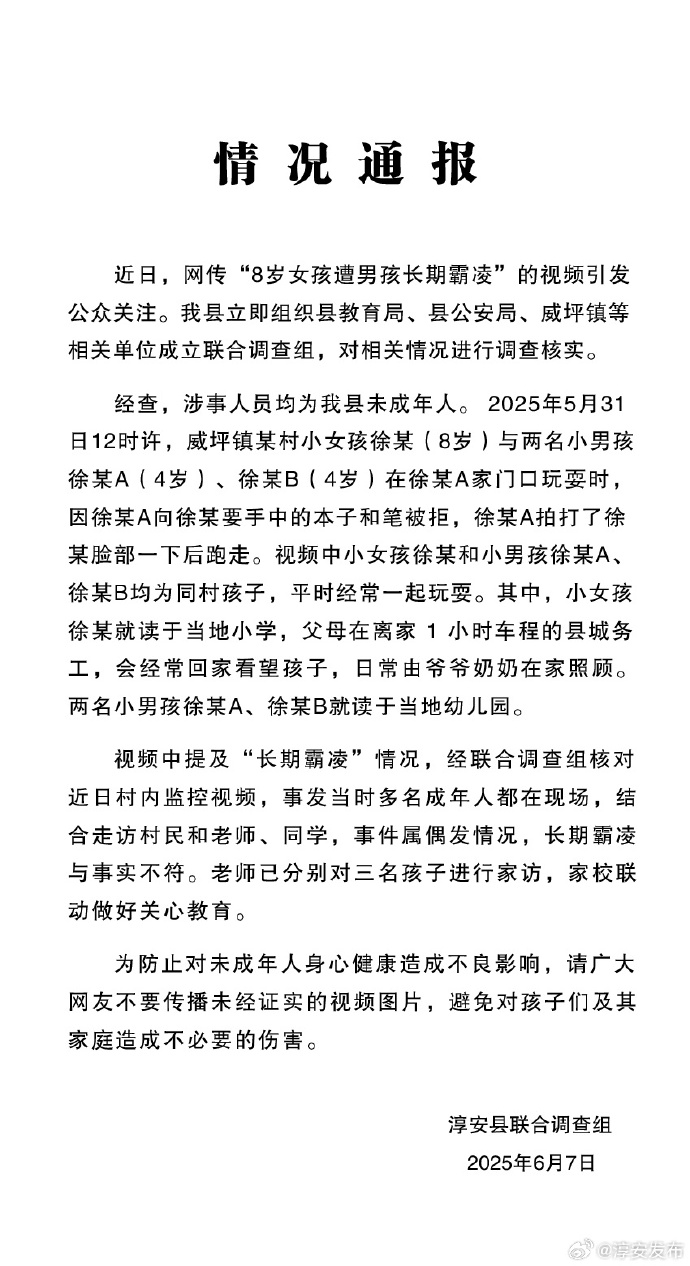 視頻中提及“長期霸凌”情況,經聯合調查組核對近日村內監控視頻,事發當時多名成年人都在現場,結合走訪村民和老師、同學,事件屬偶發情況,長期霸凌與事實不符。老師已分別對三名孩子進行家訪,家校聯動做好關心教育。