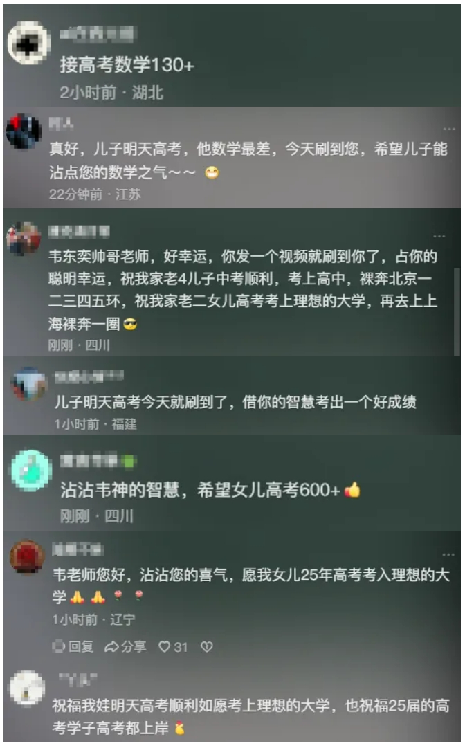 而在評論區,網友也紛紛為自家要高考的孩子許願“接高考數學130+”,“希望高考超常發揮,考到韋神的學校(北大)”。