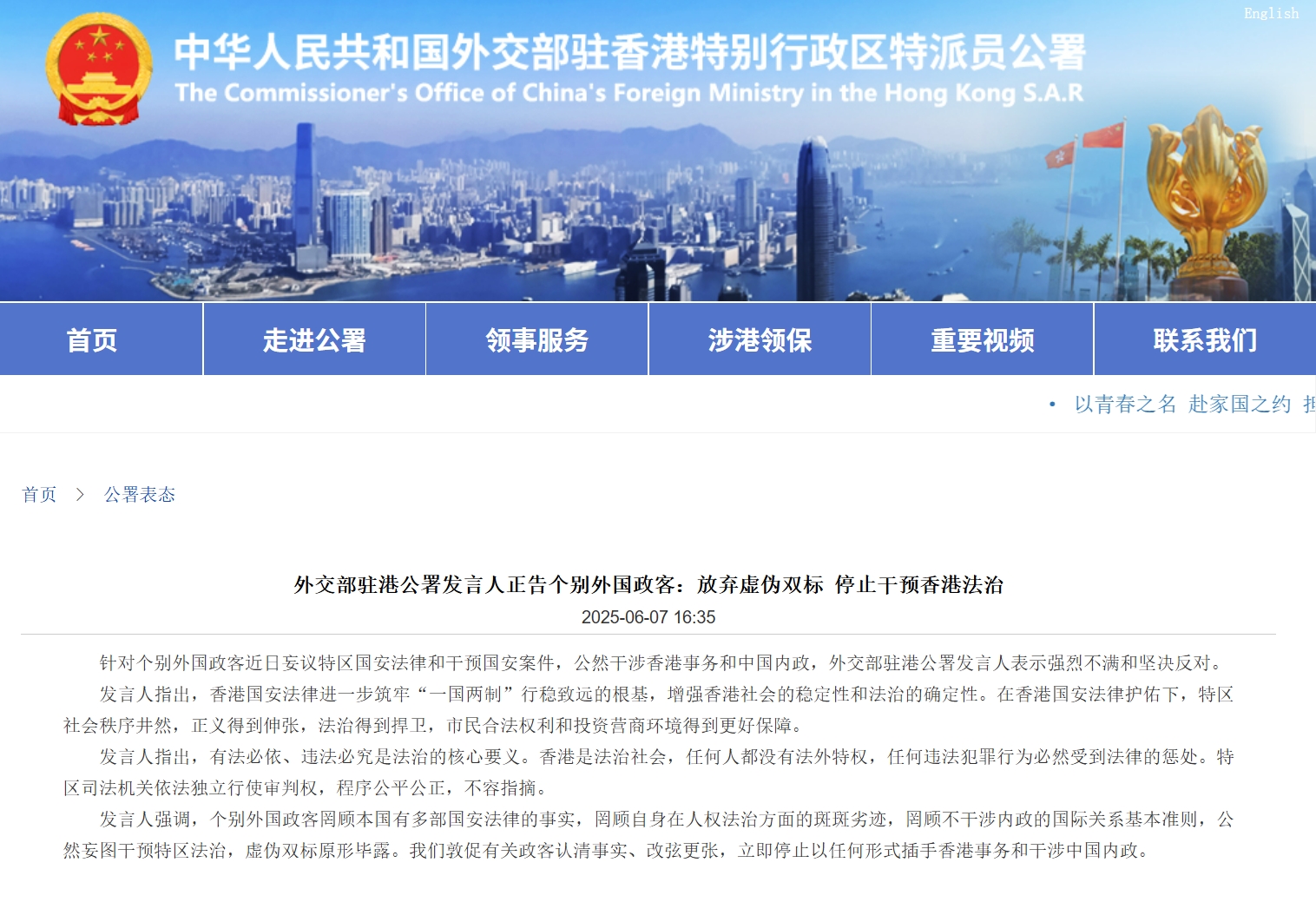 外交部駐港公署網站6月7日消息,外交部駐港公署發言人正告個別外國政客:放棄虛偽雙標,停止干預香港法治。