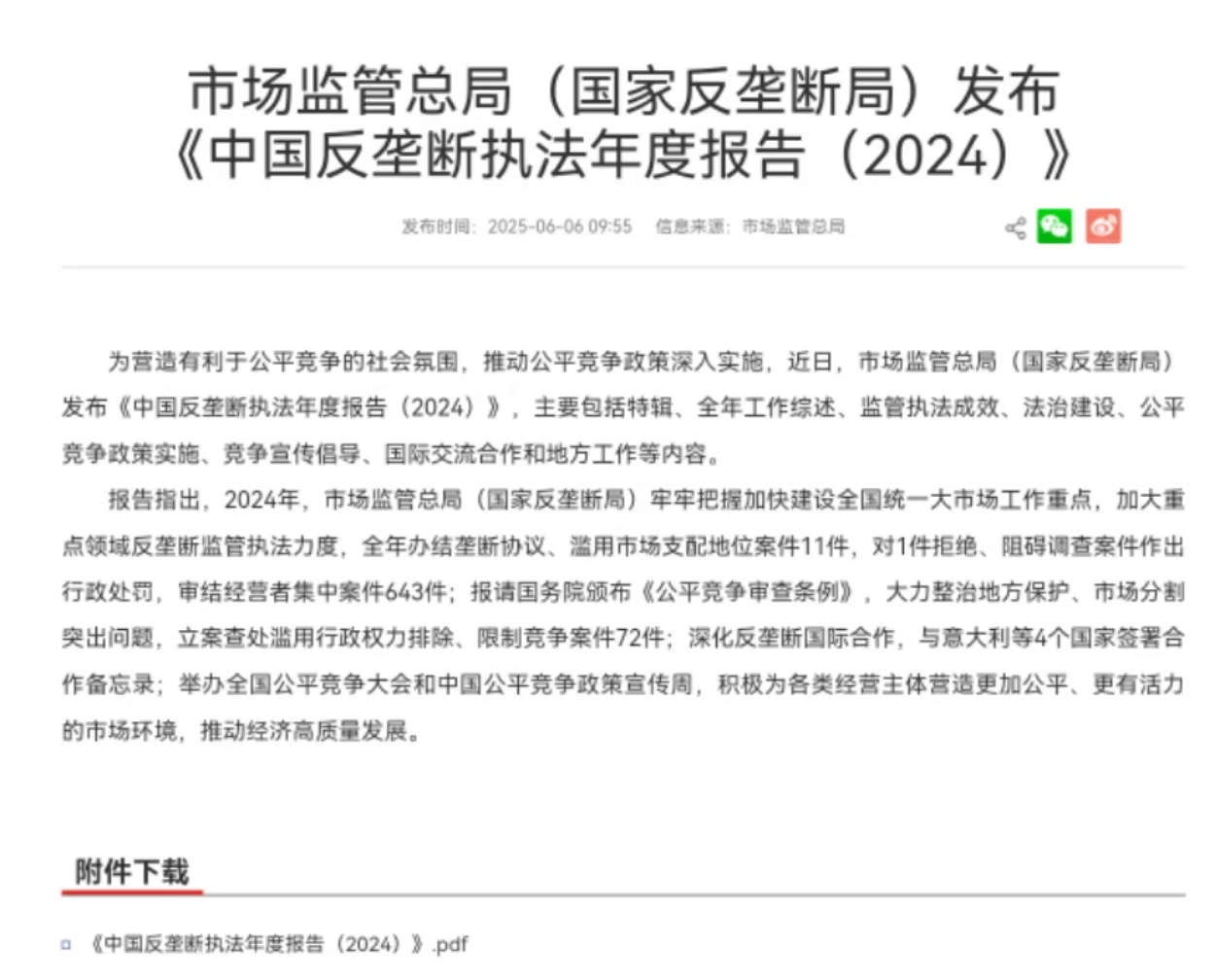 報告指出,2024年,市場監管總局(國家反壟斷局)牢牢把握加快建設全國統一大市場工作重點,加大重點領域反壟斷監管執法力度,全年辦結壟斷協議、濫用市場支配地位案件11件,對1件拒絕、阻礙調查案件作出行政處罰,審結經營者集中案件643件;報請國務院頒佈《公平競爭審查條例》,大力整治地方保護、市場分割突出問題,立案查處濫用行政權力排除、限制競爭案件72件;深化反壟斷國際合作,與意大利等4個國家簽署合作備忘錄;舉辦全國公平競爭大會和中國公平競爭政策宣傳週,積極為各類經營主體營造更加公平、更有活力的市場環境,推動經濟高質量發展。