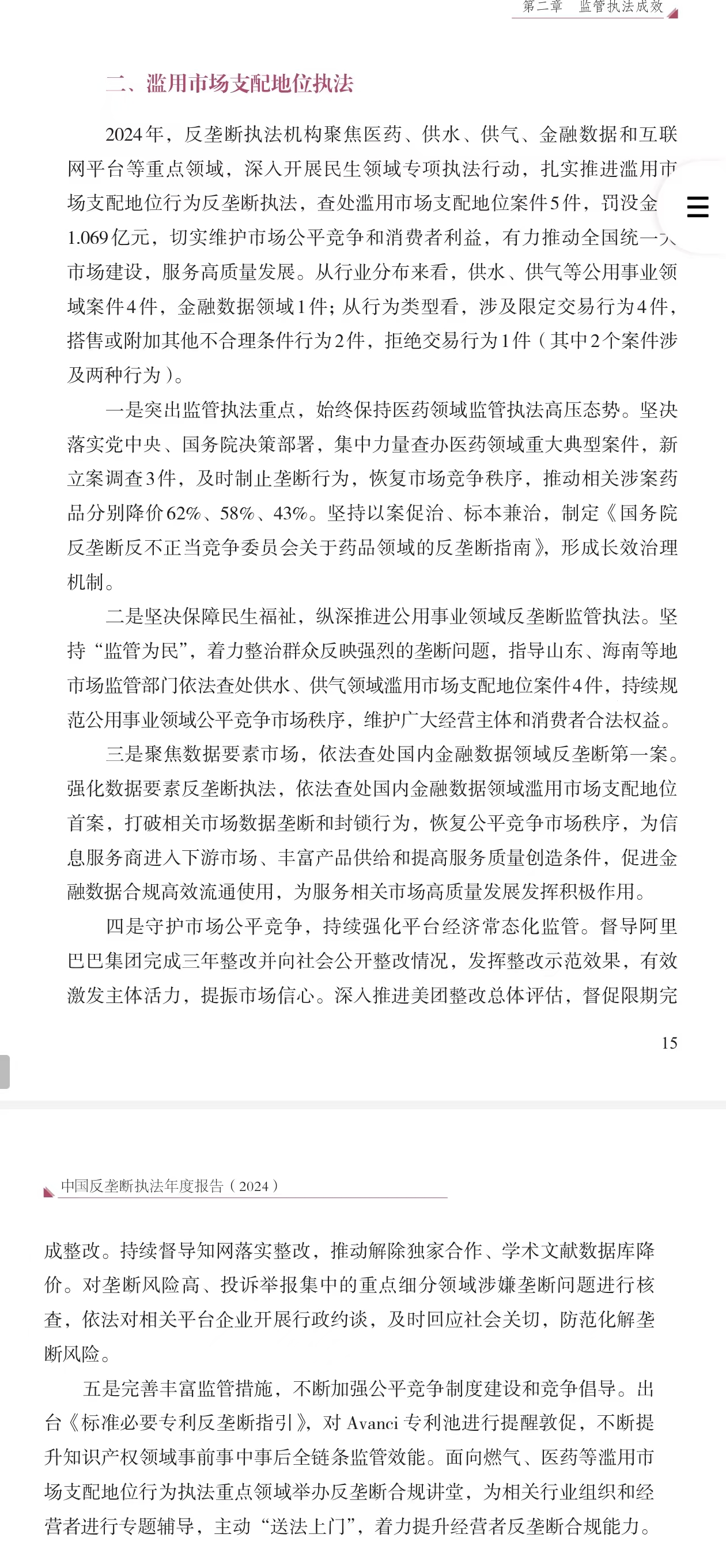 報告提到,2024年,反壟斷執法機構聚焦醫藥、供水、供氣、金融數據和互聯網平台等重點領域,深入開展民生領域專項執法行動,紮實推進濫用市場支配地位行為反壟斷執法,查處濫用市場支配地位案件5件,罰沒金額1.069億元,切實維護市場公平競爭和消費者利益,有力推動全國統一大市場建設,服務高質量發展。從行業分佈來看,供水、供氣等公用事業領域案件4件,金融數據領域1件;從行為類型看,涉及限定交易行為4件,搭售或附加其他不合理條件行為2件,拒絕交易行為1件(其中2個案件涉及兩種行為)。