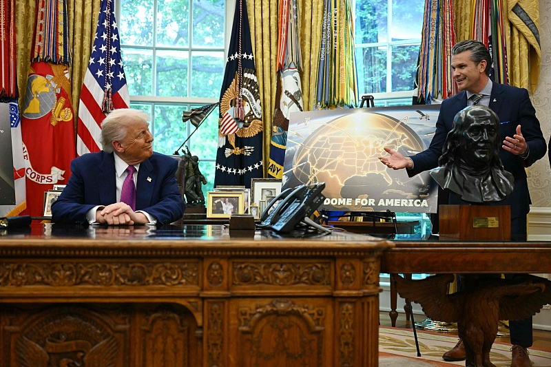 當地時間5月20日,特朗普在白宮橢圓辦公室聽取美國國防部長赫格塞思關於“黃金穹頂”導彈防禦系統的講話。 視覺中國