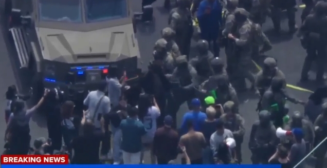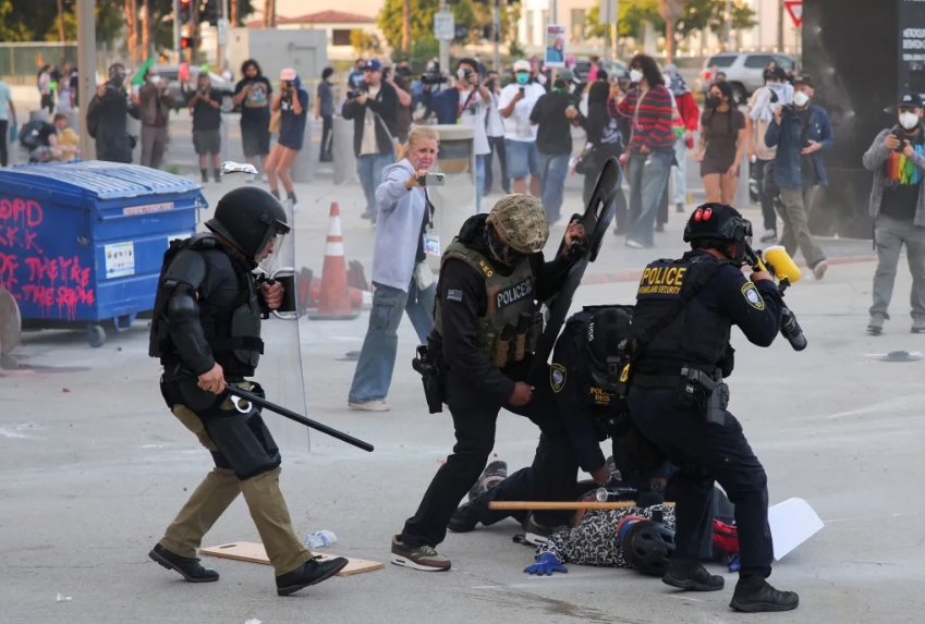 6月6日,洛杉磯,抗議者與警方在街頭爆發激烈對峙。 視頻截圖
