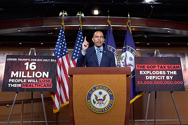 6月6日,美國國會大廈,美國眾議院少數黨領袖、民主黨人哈基姆·傑弗里斯就“大而美”法案向記者發表講話。 視覺中國