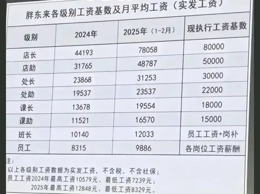 同時,胖東來的薪資水平也與公司的業績“共進退”,遠高於其他可比公司。2025年1至2月,胖東來員工在刨除社保和税的平均實發工資為9,886元,店長的月薪為78,058元,而2024年兩個職位的收入分別為8,315元和44,193元。