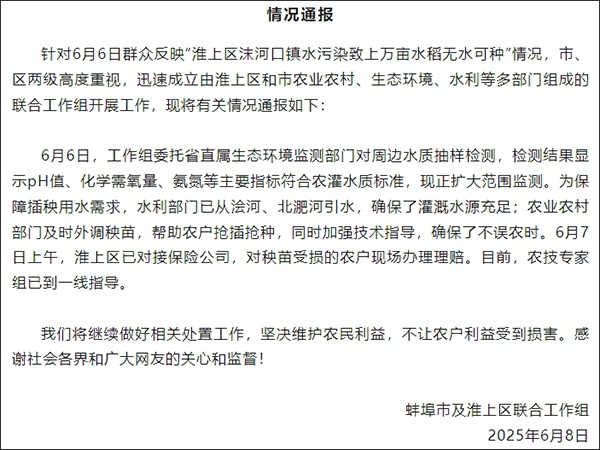 針對6月6日羣眾反映“淮上區沫河口鎮水污染致上萬畝水稻無水可種”情況,市、區兩級高度重視,迅速成立由淮上區和市農業農村、生態環境、水利等多部門組成的聯合工作組開展工作,現將有關情況通報如下: