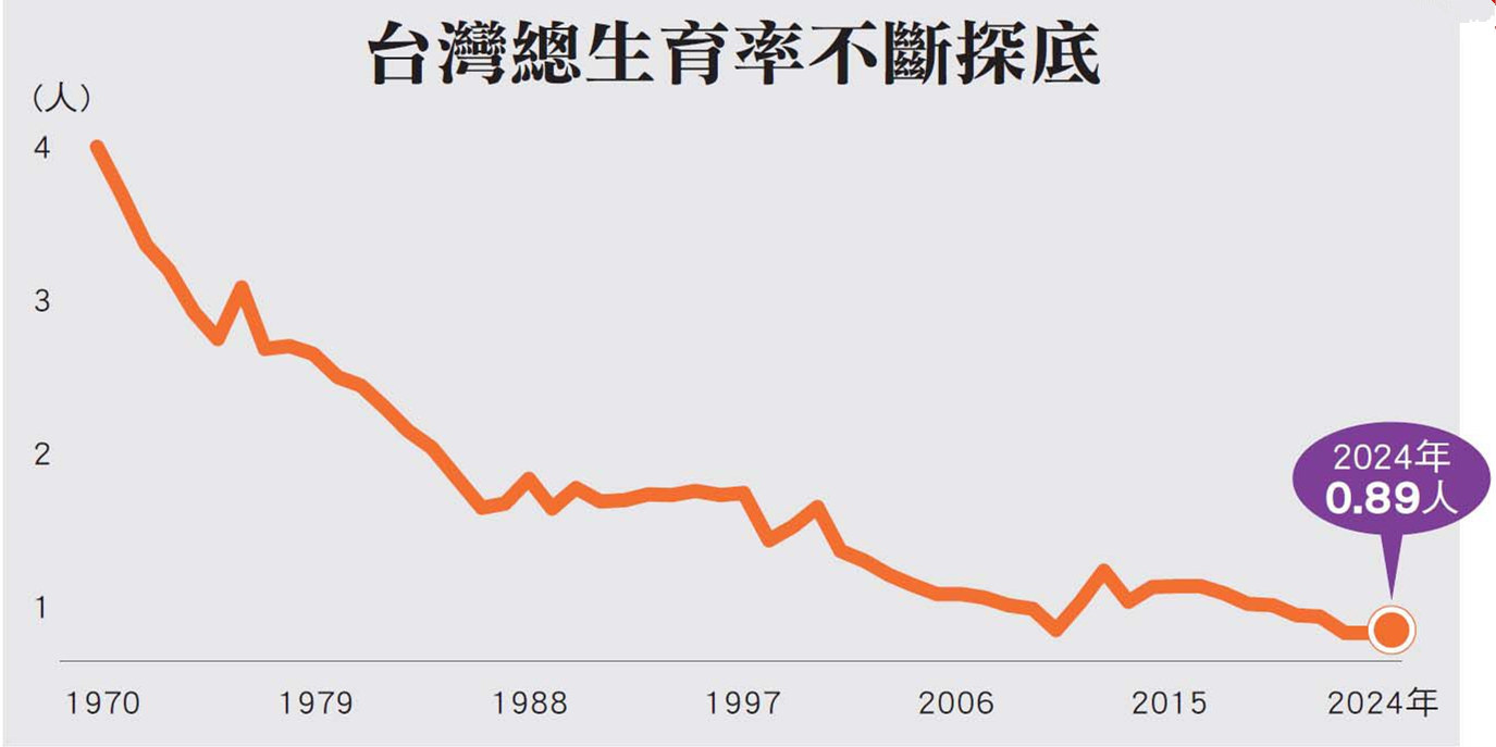 根據數據,台灣在1984年生育率2.06(低於維持穩定人口結構的人口替代水平2.1),2003年落入超低生育率水平(1.3)(2020年大陸生育率也是1.3),去年台灣生育率0.89;出生嬰兒數1980年有41萬人,去年龍年則剩13萬4000人。