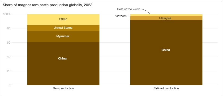 2023年,中國稀土產量全球佔比達60%以上,精煉供應量佔比達92%。 CNN製圖