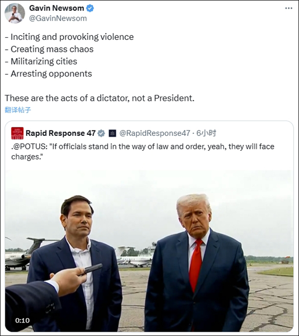 當地時間6月8日早些時候,紐森轉發了特朗普當天對記者講話的視頻,並配文稱,煽動和挑起暴力、製造大規模混亂、將城市軍事化、逮捕反對者,這些都是獨裁者的行徑,不是總統的行為。