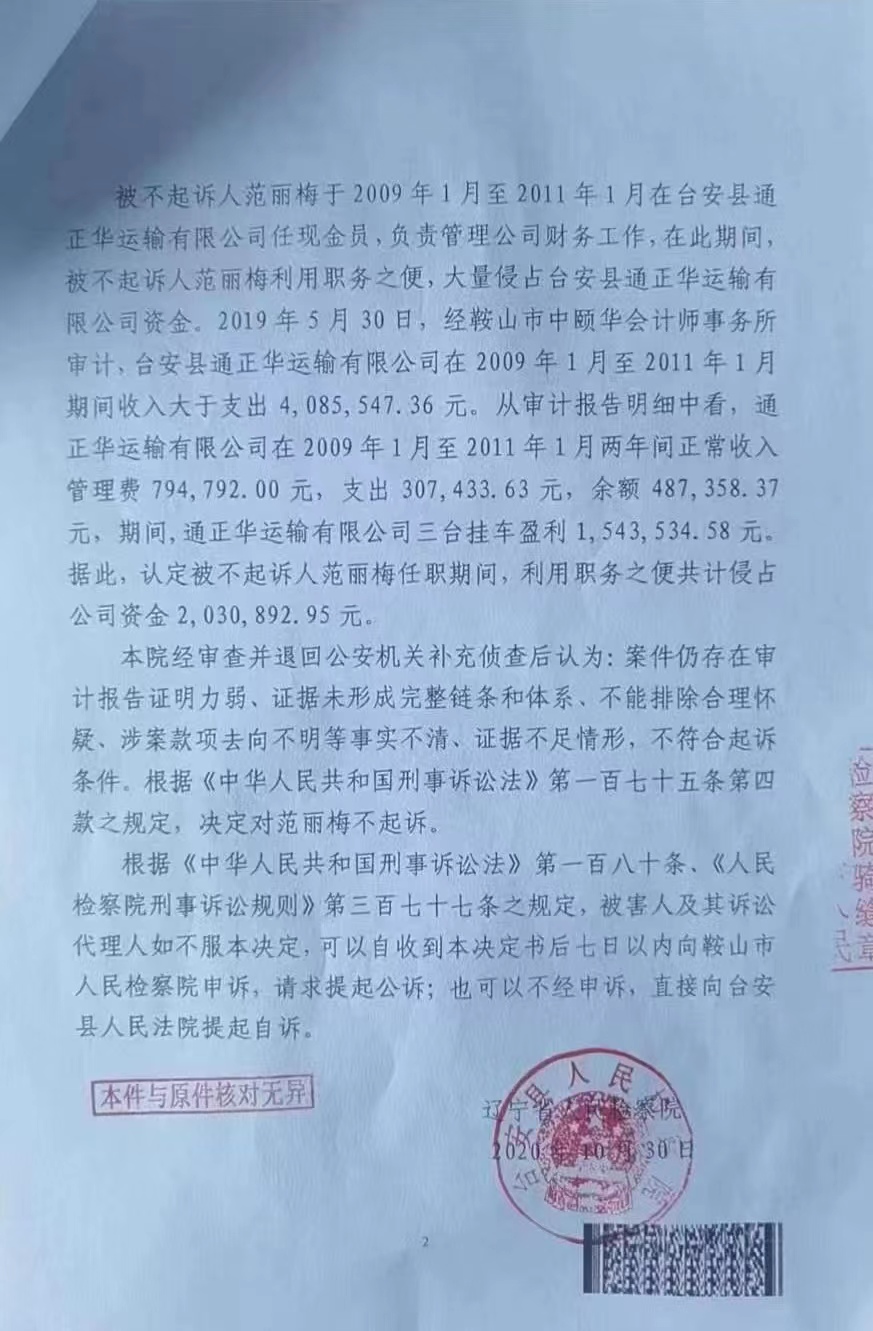 鞍山市檢察院作出的《複核決定書》,認為範麗梅不構成職務侵佔罪。