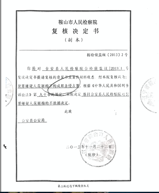 在台安縣檢察院第四次不予批捕後,台安縣公安局向台安縣檢察院申請複議。經複議,台安縣檢察院仍認為案件事實不清、證據不足,決定維持不予批捕決定。台安縣公安局仍不服,向鞍山市檢察院申請複核。鞍山市檢察院複核認為,範麗梅不構成職務侵佔罪,遂於2013年11月22日決定維持台安縣檢察院對範麗梅的不批捕決定。同月28日,因取保候審屆滿,範麗梅被解除取保候審。