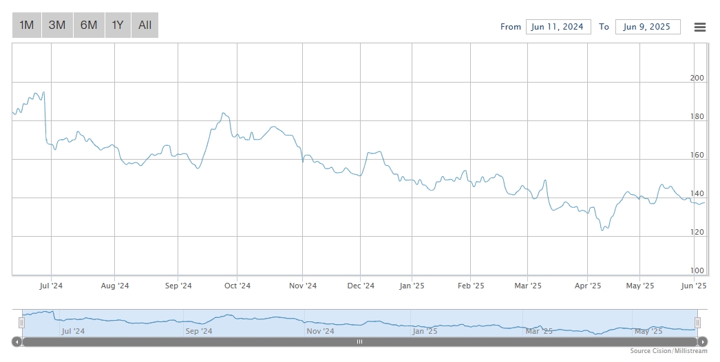 同時,管理層的信心並不等於二級市場的信心,今年以來,H&M的股價還在持續下探。從今年年初的148.75瑞典克朗/股(約合人民幣111.08元)跌至6月6日的137.40瑞典克朗/股(約合人民幣102.60元),期間,最低達到了122.90瑞典克朗/股(約合人民幣91.77元)。
