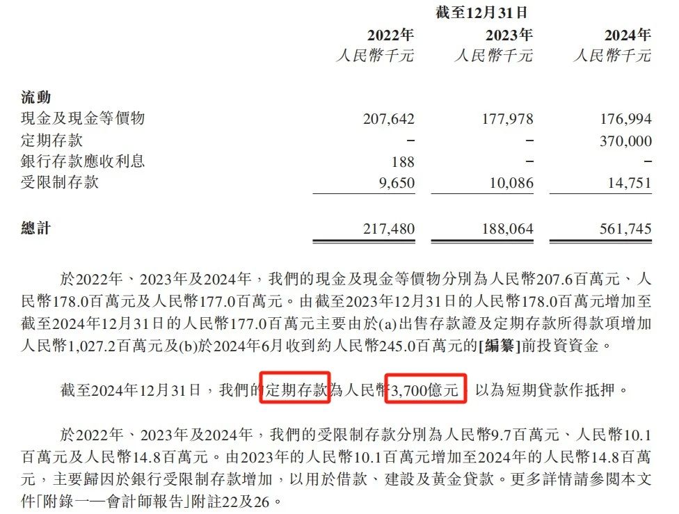 最後,週六福還揹負着對賭壓力。若未能在規定時間內成功IPO,週六福將面臨回購前投資者所持股份的不利局面,這或是其執着於上市的另一重要原因。據媒體此前披露,2023年11月至2024年1月,李偉柱等已與相關股東簽訂股權轉讓協議,回購了相關股東當時持有的絕大部分股權,總計耗資約1.64億元。其着急情緒,也能從招股書中直觀感受到:截至2024年12月31日,週六福的定期存款共計3.7億元,但其卻在招股書裏寫成了“3700億元”,出現了低級錯誤。