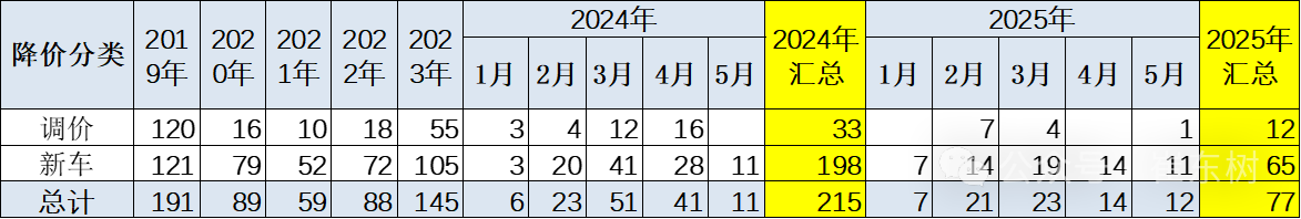 就5月而言,降價車型規模為12款,較同期多1款。其中燃油車1款,較去年同期減少7款;油電混動車0款,較去年同期減少2款;插電混動汽車3款,較去年同期增加3款;增程式車型2款,較去年同期增加2款;純電動車型6款,較去年同期增加5款。