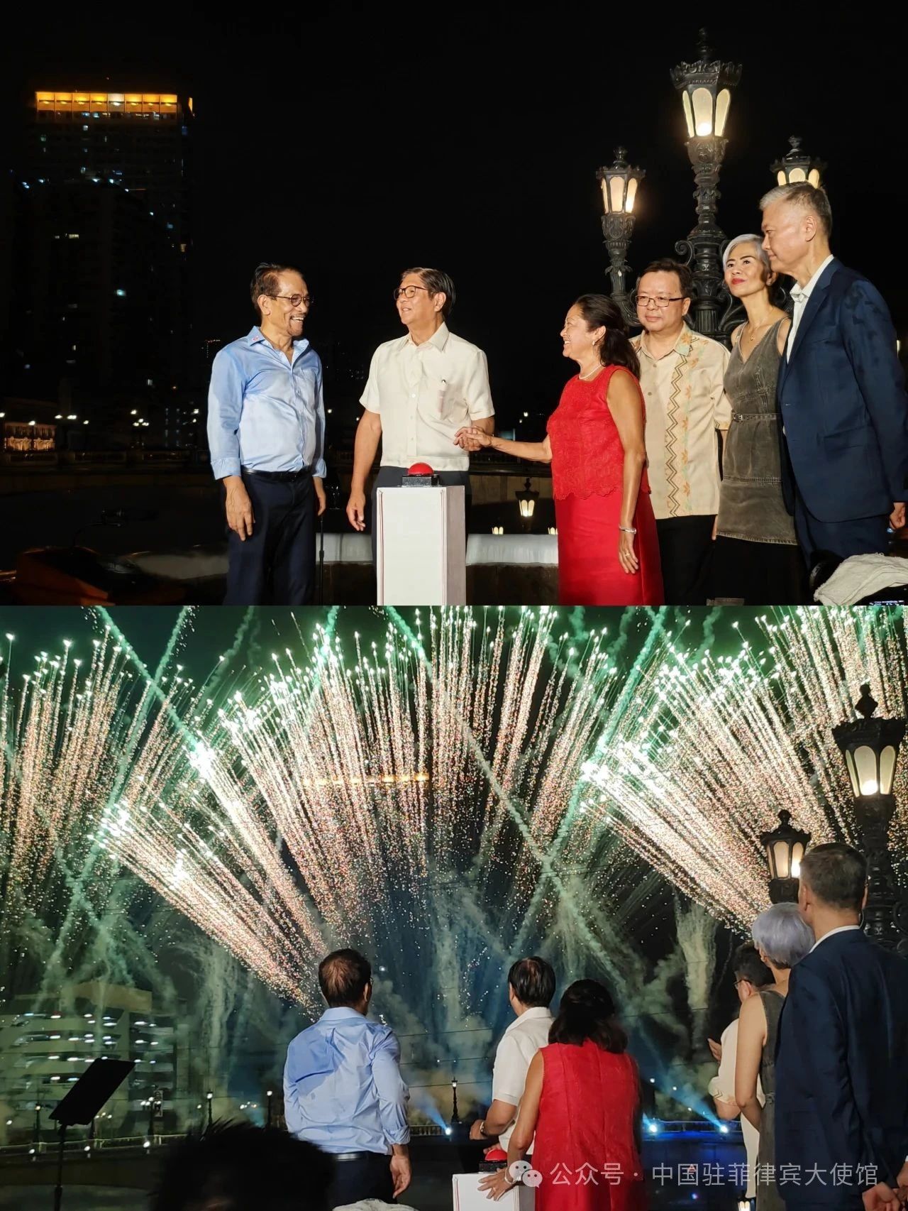 據微信公眾號“中國駐菲律賓大使館”消息,6月7日晚,菲律賓總統馬科斯夫婦在馬尼拉市帕西格河畔舉行燈光煙火秀,慶祝中菲建交50週年。黃溪連大使應邀出席並致辭。菲參議長埃斯庫德羅、候任外長拉扎羅等內閣部長、皮門特爾等參眾議員、馬尼拉市市長拉古納和候任市長莫雷諾,菲華商聯總會理事長林榮輝和其他華社負責人,各界人士代表以及使館主要外交官出席了活動。