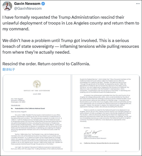 紐森發帖,要求特朗普將國民警衞隊撤出洛杉磯。
