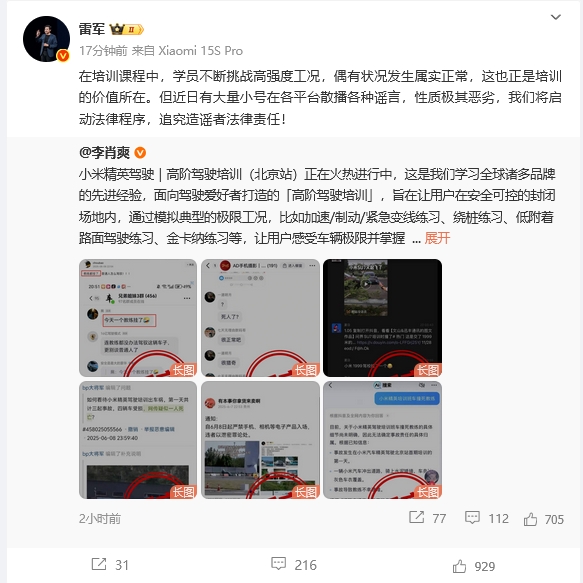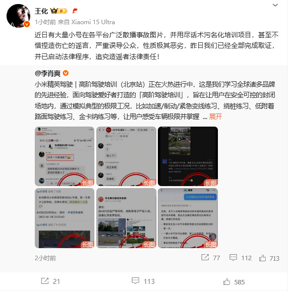 近日,小米精英駕駛|高階駕駛培訓(北京站)正在進行中。針對近期網絡廣泛傳播的“小米汽車高階駕駛培訓發生致命車禍”傳聞,小米汽車副總裁李肖爽10日通過微博發佈聲明回應:相關內容均為惡意造謠,將追究造謠者法律責任。