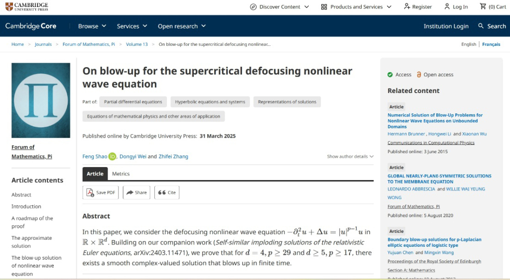 韋東奕近日與其他兩位學者合作在期刊《Forum of Mathematics, Pi》以“On blow-up for the supercritical defocusing nonlinear wave equation(超臨界散焦非線性波動方程的爆破現象研究)”為題發文。