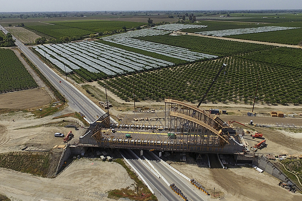 2025年4月15日,美國加州弗雷斯諾縣,懸索拱橋施工現場俯瞰圖。 視覺中國