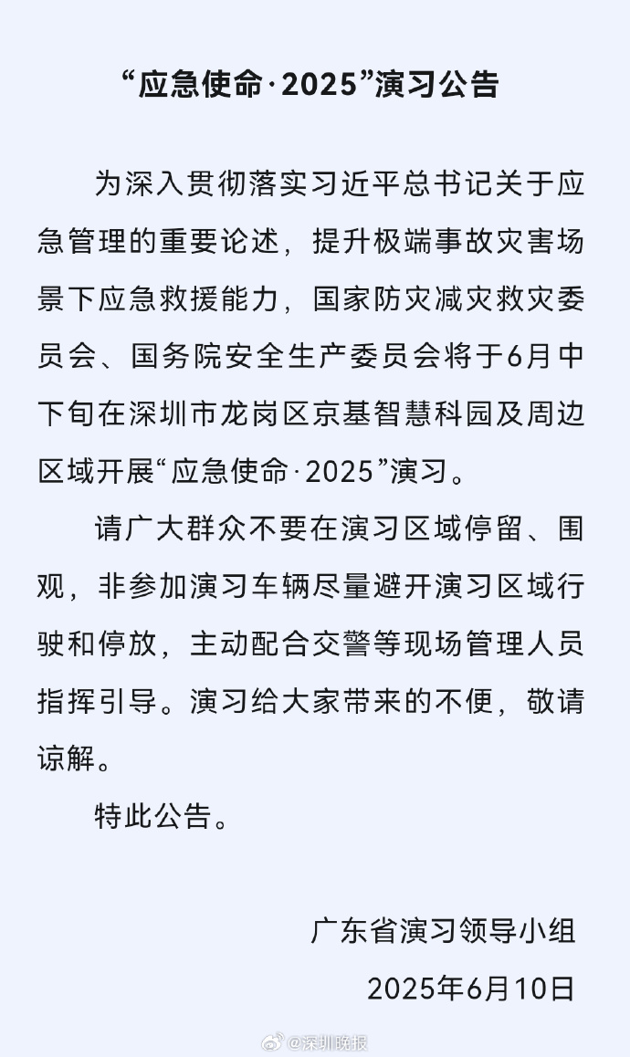 經核實濃煙源自一場消防演習,深圳消防已於上午9時08分發布公告,提醒廣大市民有“應急使命·2025”演習。