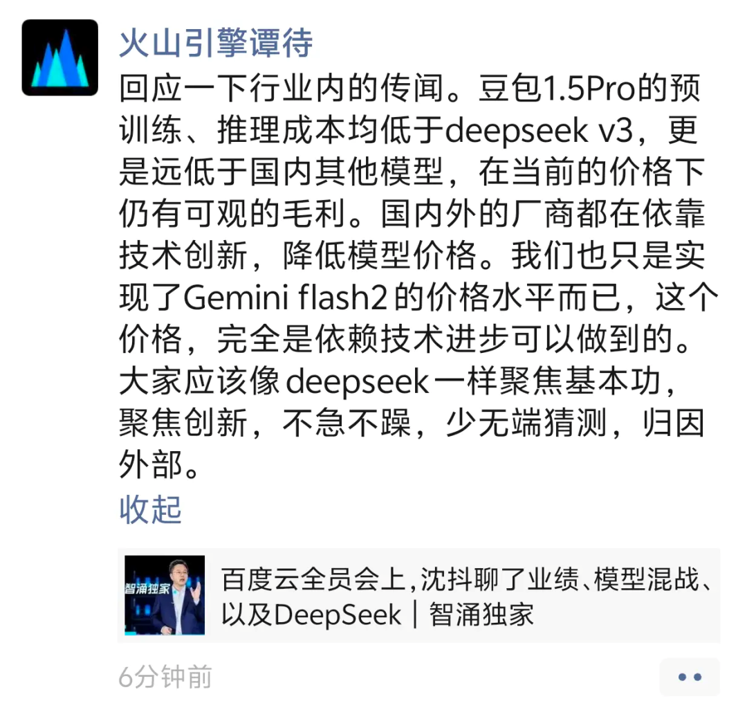 不過火山引擎總裁譚待當時在朋友圈直接針對相關報道指出,豆包1.5 Pro成本遠低於國內其它模型,在當前價格下仍有可觀的毛利。界面新聞的報道則提到,在火山引擎上售賣API的豆包1.5 Pro,毛利率達到50%。