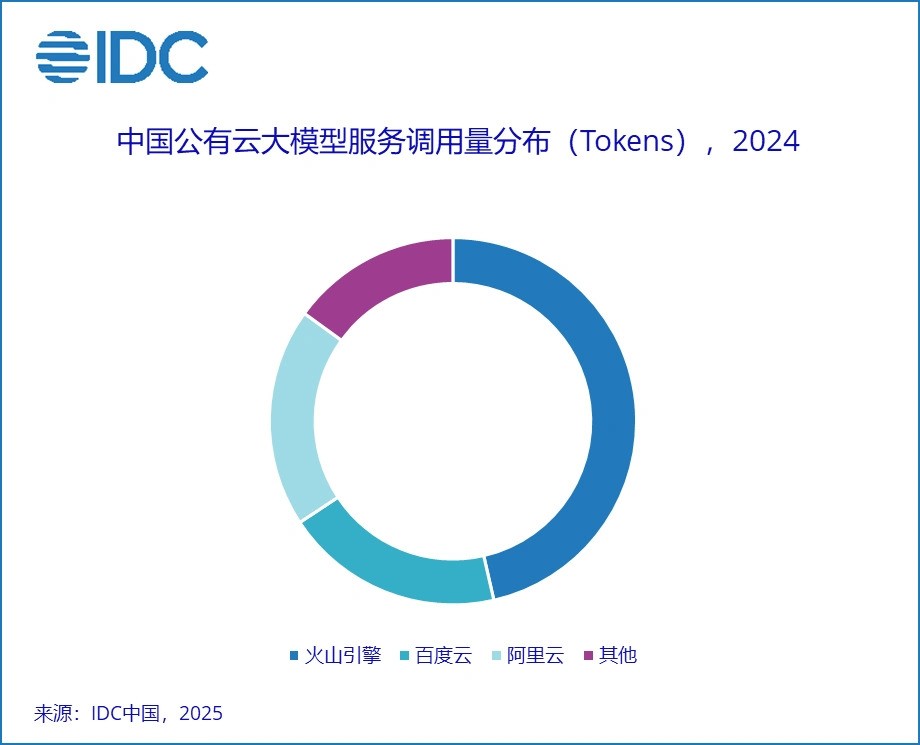 國際數據公司(IDC)數據顯示,2024年,中國公有云大模型調用量達114.2萬億Tokens,其中火山引擎獨佔46.4%,相當於百度與阿里之和。2025年3月,豆包大模型日均tokens調用量12.7萬億,同比增長近100倍。