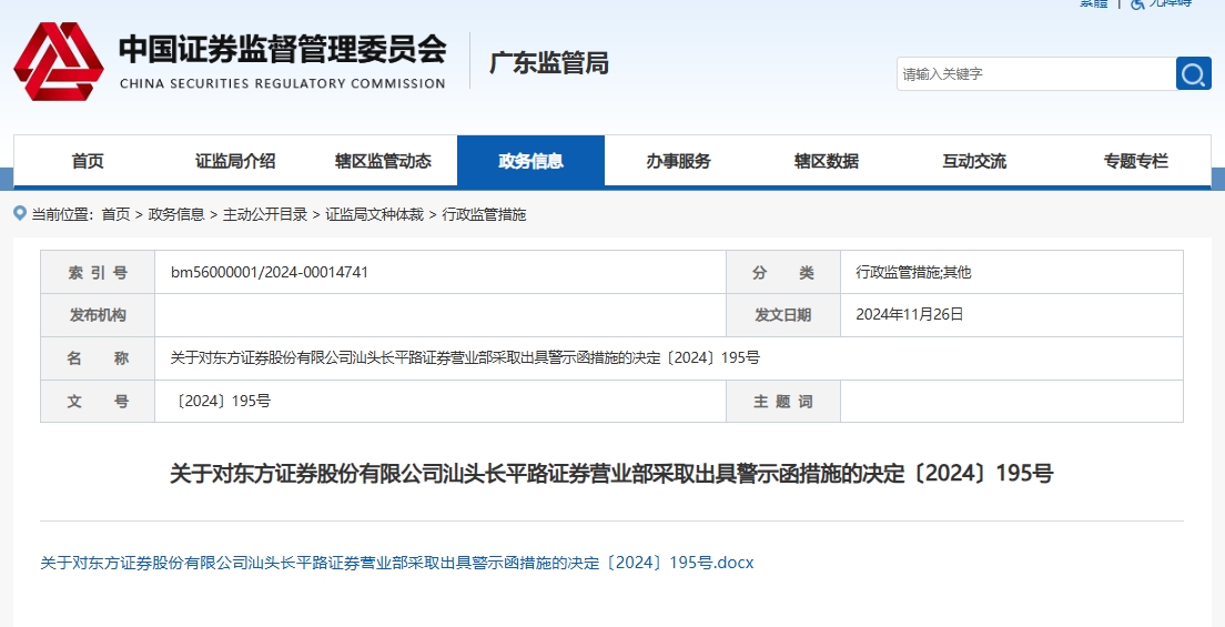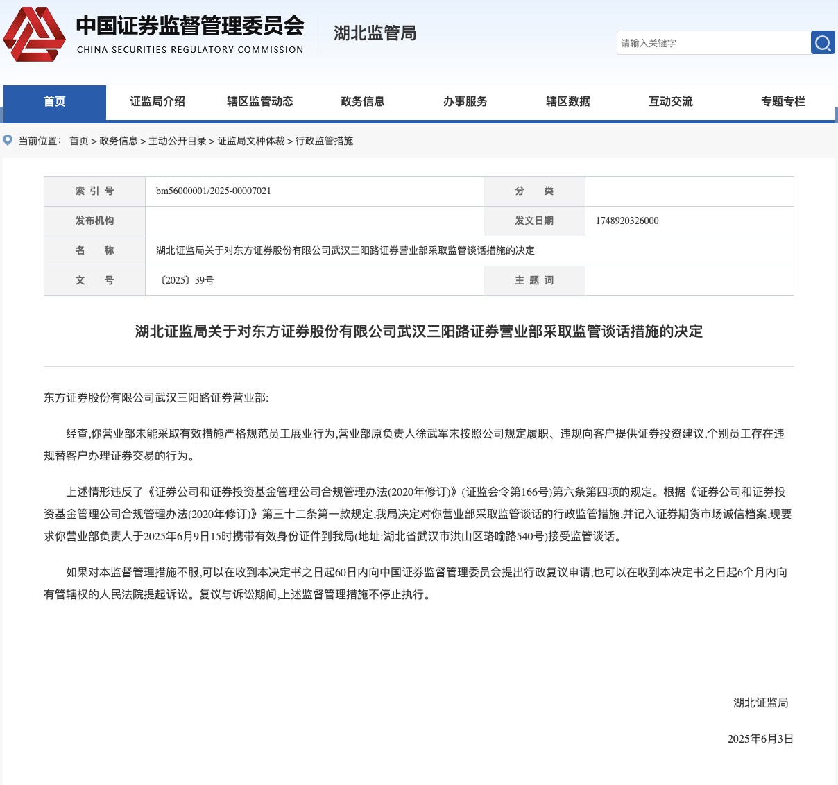 6月3日,湖北證監局官網發佈公告,依據《證券公司和證券投資基金管理公司合規管理辦法》相關規定,對東方證券武漢三陽路證券營業部及其原負責人徐武軍採取監管談話的行政監管措施。