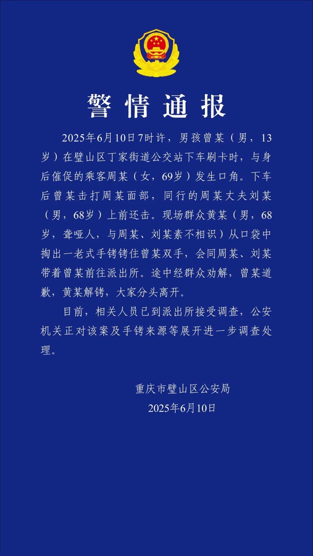 2025年6月10日7時許,男孩曾某(男,13歲)在璧山區丁家街道公交站下車刷卡時,與身後催促的乘客周某(女,69歲)發生口角。下車後曾某擊打周某面部,同行的周某丈夫劉某(男,68歲)上前還擊。現場羣眾黃某(男,68歲,聾啞人,與周某、劉某素不相識)從口袋中掏出一老式手銬銬住曾某雙手,會同周某、劉某帶着曾某前往派出所。途中經羣眾勸解,曾某道歉,黃某解銬,大家分頭離開。