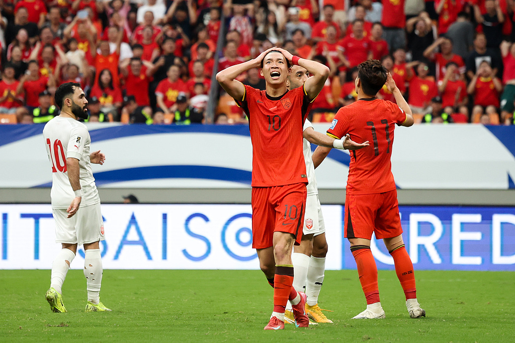 上半場第32分鐘,國足錯過最佳得分良機,張玉寧反越位突入禁區底線倒三角回敲,王鈺棟幾乎面對大半個空門情況下推射發力過猛將球打高。