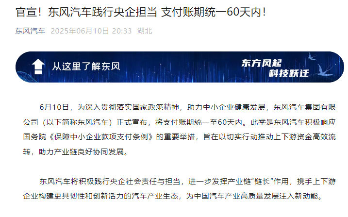 東風汽車表示,6月10日,為深入貫徹落實國家政策精神,助力中小企業健康發展,東風汽車集團有限公司(以下簡稱東風汽車)正式宣佈,將支付賬期統一至60天內。此舉是東風汽車積極響應國務院《保障中小企業款項支付條例》的重要舉措,旨在以切實行動推動上下游資金高效流轉,助力產業鏈良好協同發展。