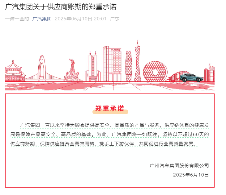 廣汽集團強調,廣汽一直以來堅持為顧客提供高安全、高品質的產品與服務;供應鏈體系的健康發展是保障產品高安全、高品質的基礎。為此,廣汽集團將一如既往,堅持以不超過60天的供應商賬期,保障供應鏈資金高效週轉,攜手上下游夥伴,共同促進行業高質量發展。