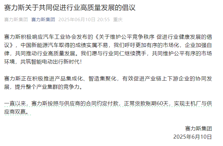 賽力斯集團表示,一直以來,賽力斯按照與供應商的合同約定付款,正常貨款賬期60天,實現主機廠與供應商雙贏。賽力斯積極響應汽車工業協會發布的《關於維護公平競爭秩序 促進行業健康發展的倡議》,呼籲更加有序的市場化,企業加強自律,共同推動行業高質量發展。