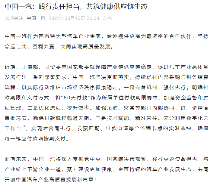 【文/觀察者網 潘昱辰 編輯/高莘】6月10日晚,中國一汽、東風汽車、廣汽集團、賽力斯集團等汽車企業陸續發佈承諾:對供應商賬期不超過60天。