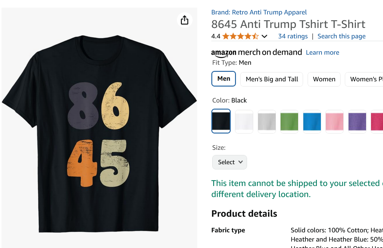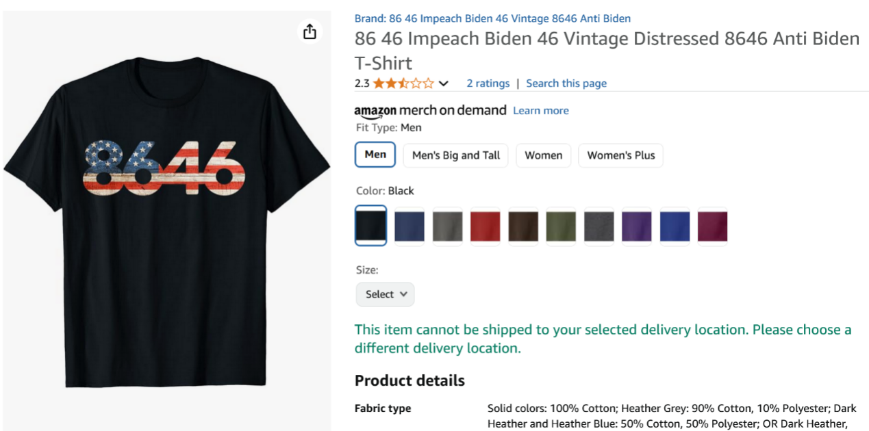 比如你現在還能在亞馬遜上看到印有“8646”字樣,簡介裏寫着“反拜登”的T恤: